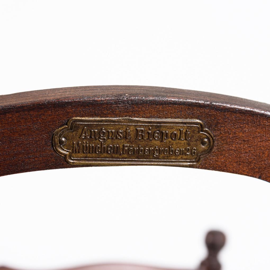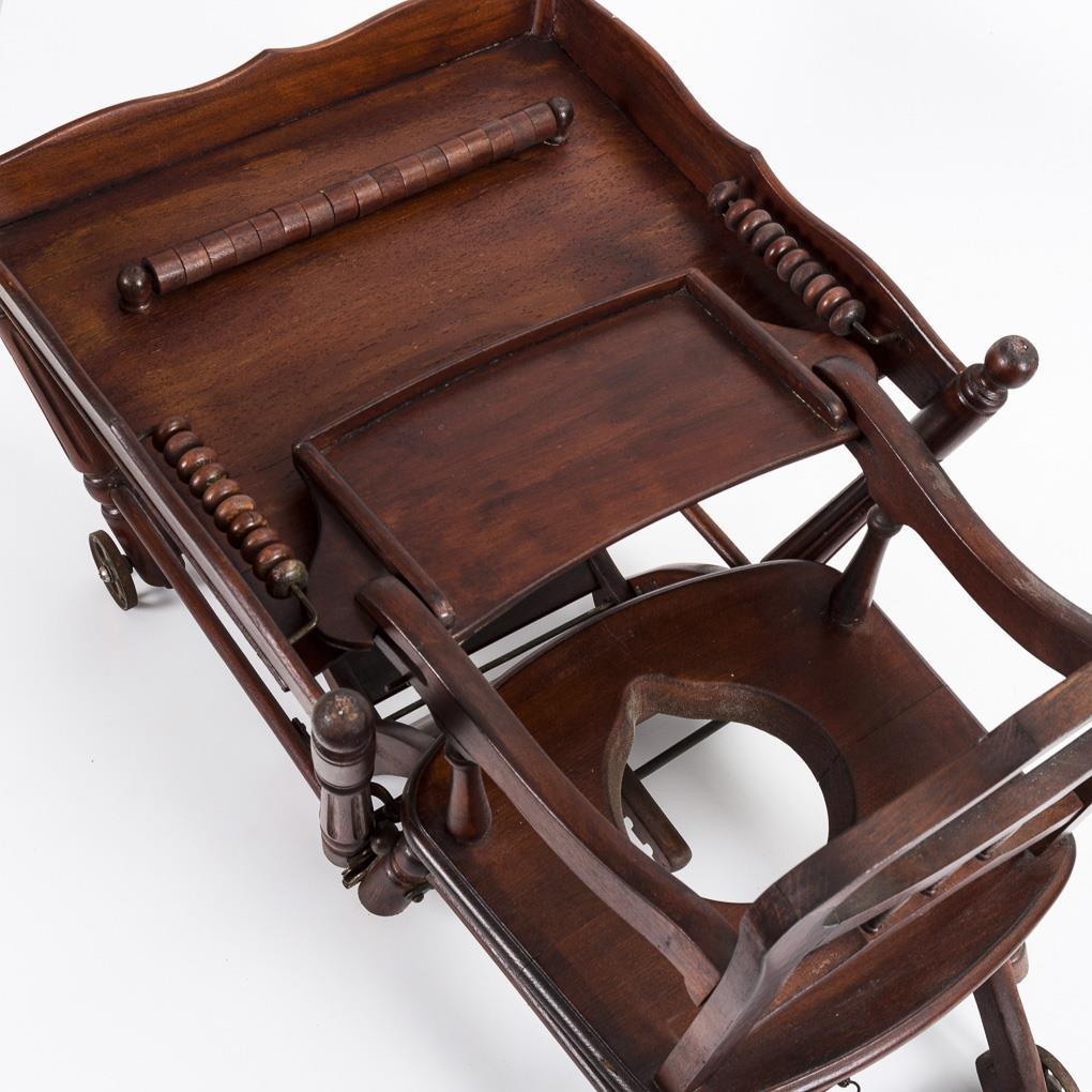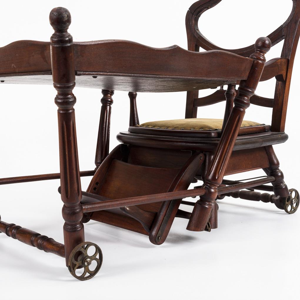 Umklappbarer Multifunktionsstuhl, auch als Toilettenstuhl oder kleiner Stuhl mit Tischchen verwendbar. Alters- und Gebrauchsspuren, Ergänzungen, Rückenpolsterung fehlt.