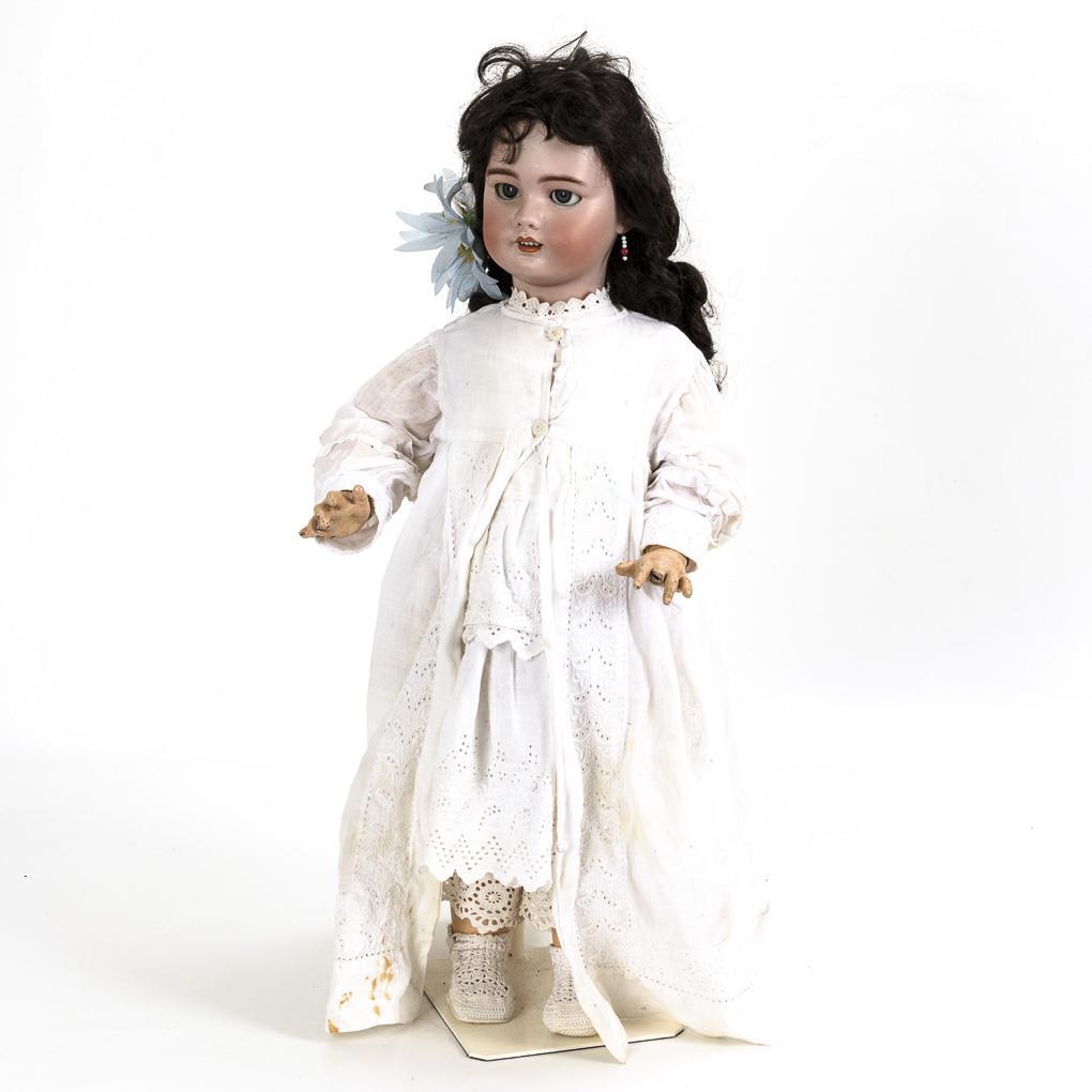 Kurbelkopf, blaue Schlafaugen, Ohrringe, Korkdeckel, ergänzte schwarze Perücke. 13-teiliger Gliederkörper mit intakter Stimme. Weißes Kleid, Häkelschuhe. Risse im Kopf. Körper mit geklebtem, 2-geteiltem Torso. Farbdefekte, linker Fuß repariert, 1 Finger fehlt.