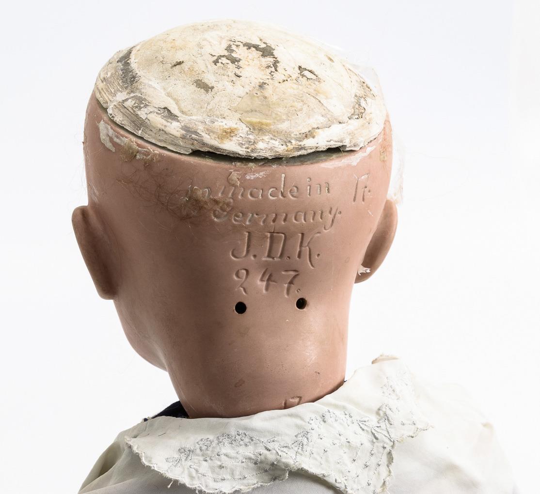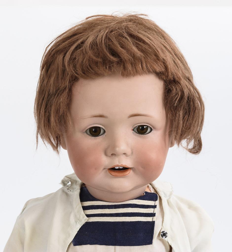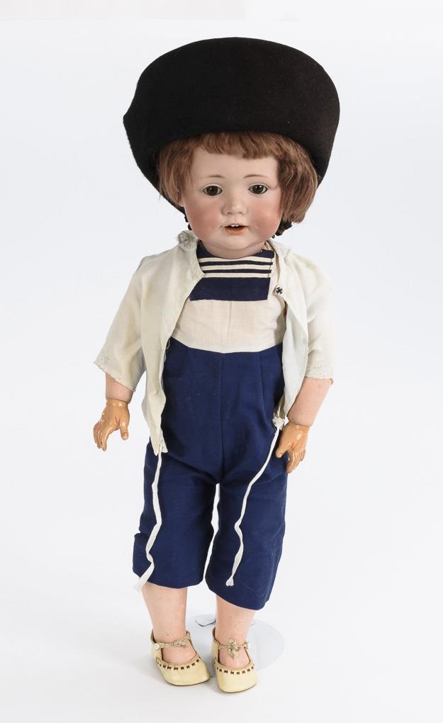 Kurbelkopf, braune Schlafaugen, rötliche Mohairperücke. 15-teiliger Toddlerkörper. Matrosenanzug, schwarzer Filzhut, weiße Schuhe. Kopf mit restauriertem Riss an der Stirn. Hände wohl ergänzt.