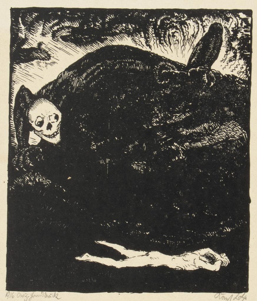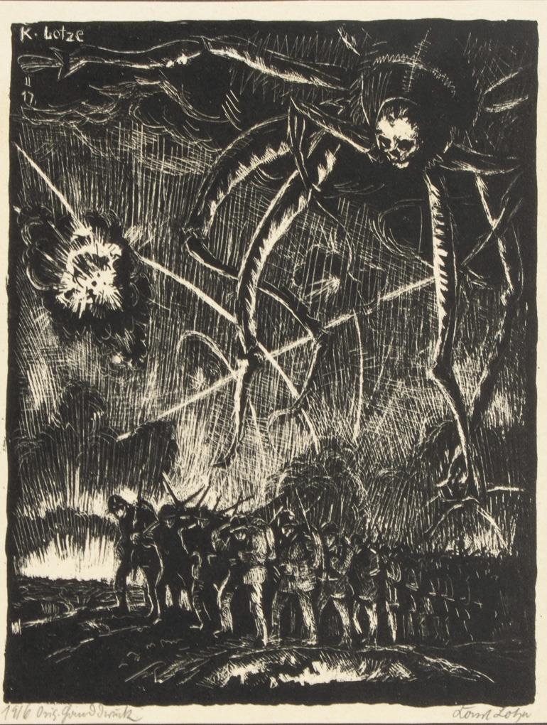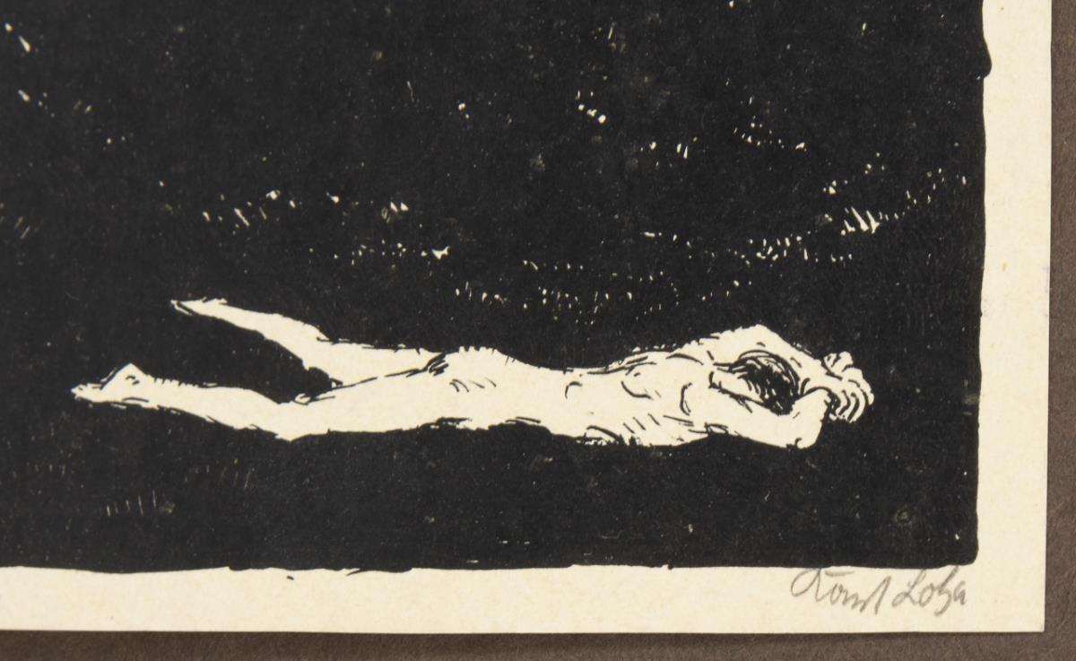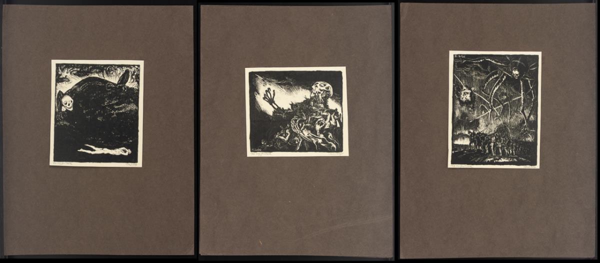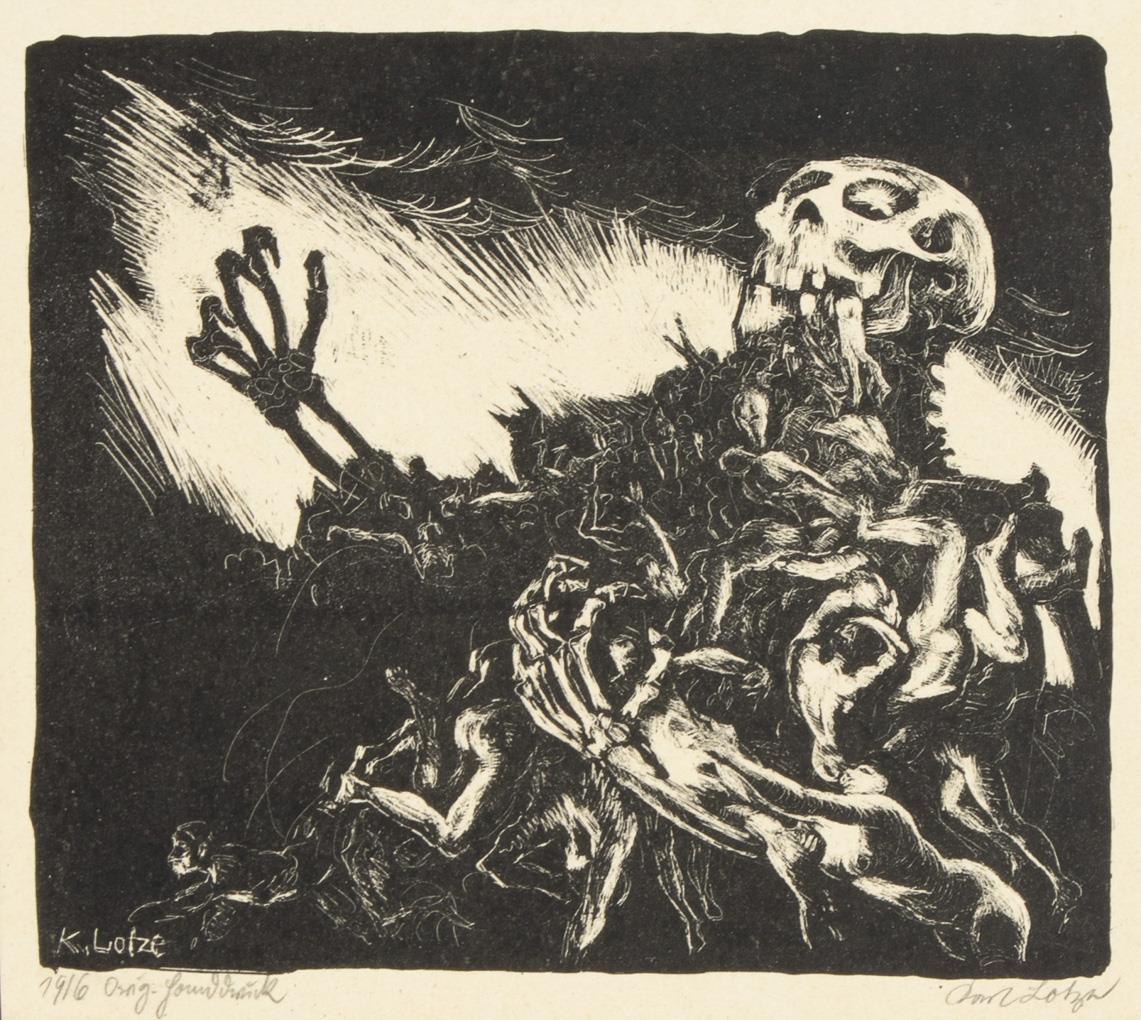 "Der Tod frißt die Menschheit", Blatt: 11,5 x 13,2 cm, verso Stempel "Karl Lotze", verso betitelt, auf braunem Papier montiert 32 x 24,8 cm | Ohne Titel, Blatt: 14,8 x 11,8 cm, auf braunem Papier montiert 32 x 24,8 cm | "Der Mensch und das Schicksal", Blatt: 13,7 x 12 cm, verso Stempel "Karl Lotze", verso betitelt, auf braunem Papier montiert 32 x 24,8 cm.