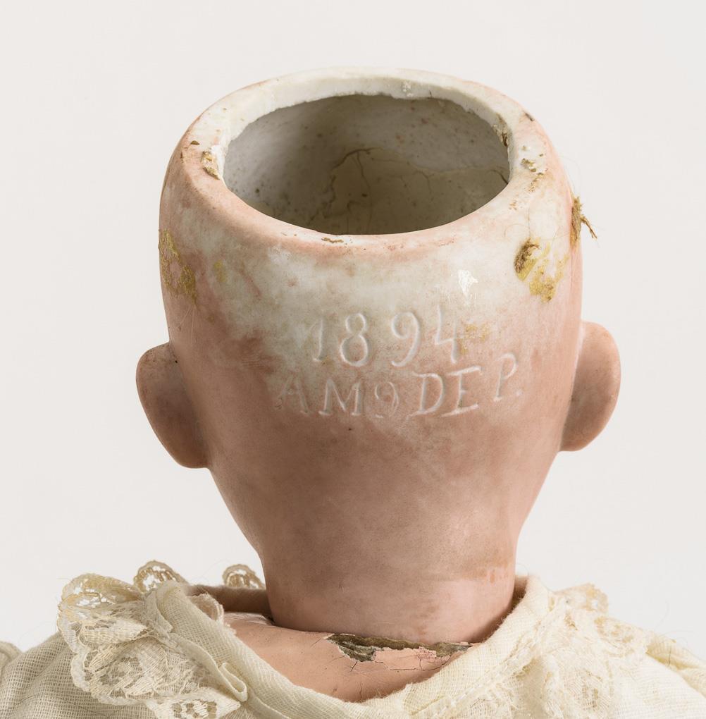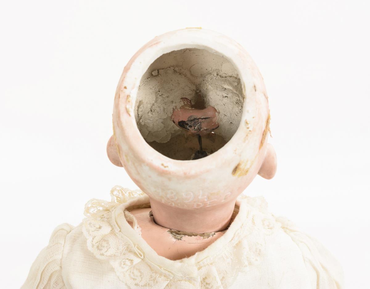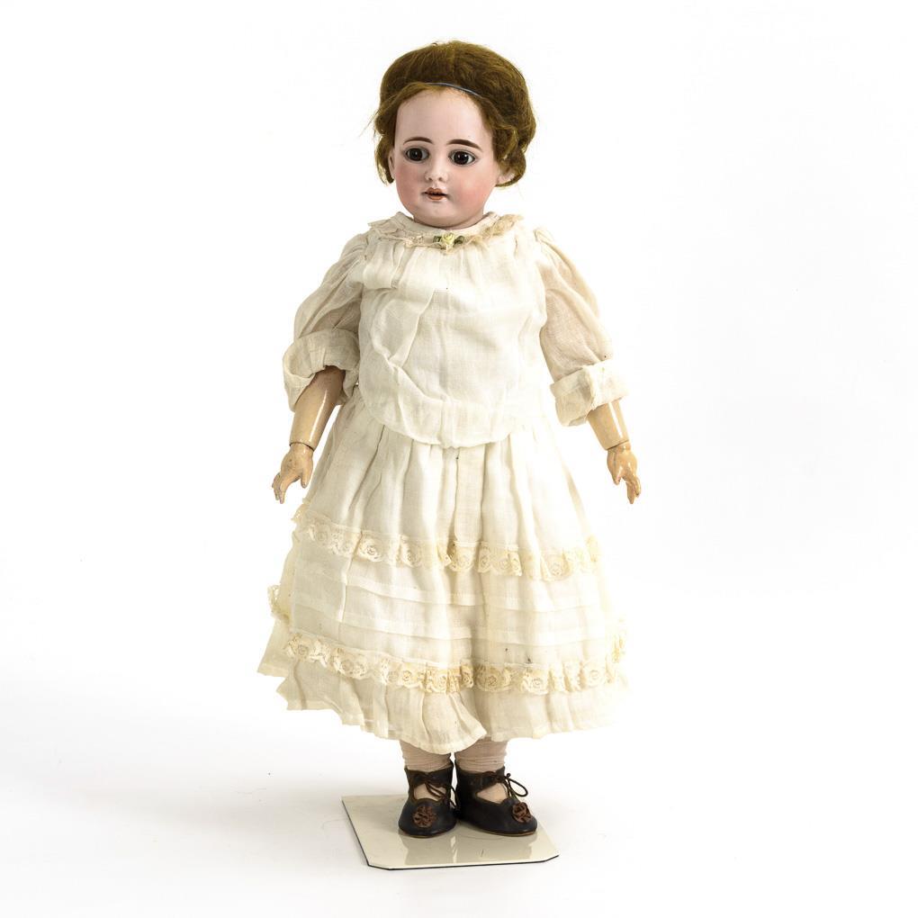 Kurbelkopf, braune Schlafaugen, rotbraune Mohairperücke. 15-teiliger Gliederkörper. Weißes Kleid, schwarze Lederschuhe. Kopf durchleuchtet: ohne Defekte, jedoch Schlafaugen festgegipst. Rechter Fuß mit Reparatur, kleine Farbdefekte am Körper.
