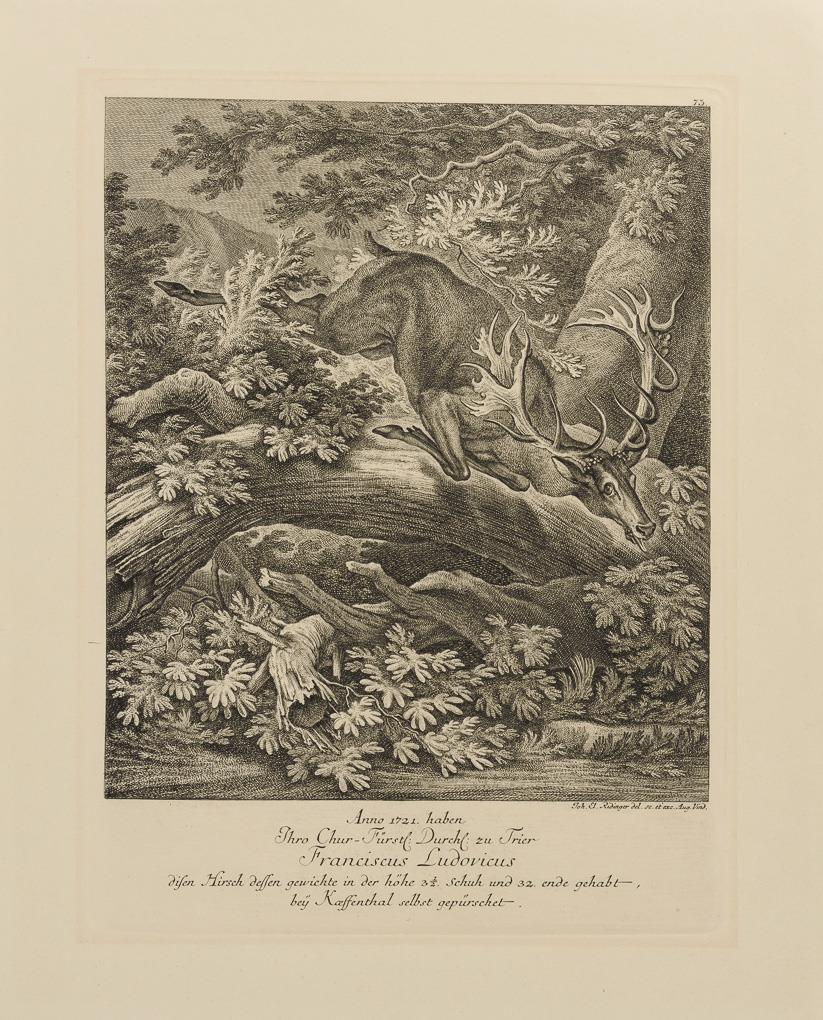 "Baum-Marder No. 86", Platte: 18,5 x 15 cm, Blatt: 28 x 21 cm | "Siebenbürger. Cheval Transylvanie. Equs Transylvaniae", Blatt: 27 x 34,5 cm, Blatt beschnitten | "Verbirgst Du Dein Angesicht, so erschröken sie; [...]", Platte: 36,5 x 27,5 cm, Blatt: 38 x 29,4 cm, Blatt stockfleckig und mit Lichtschaden | "Anno 1721 haben Ihro Chur-Fürstli. Durchl. zu Trier Franciscus Ludovicus diesen Hirsch [...]", Platte: 34,8 x 26,5 cm, Blatt: 42,5 x 35 cm, jüngerer Nachdruck, Lichtschaden | "Ein Hirsch von 8 änden, welcher gantz [...], Platte: 34,5 x 43 cm, Blatt: 39,3 x 49 cm, jüngerer Nachdruck, Ecke oben links mit Defekt, etwas griffspurig.