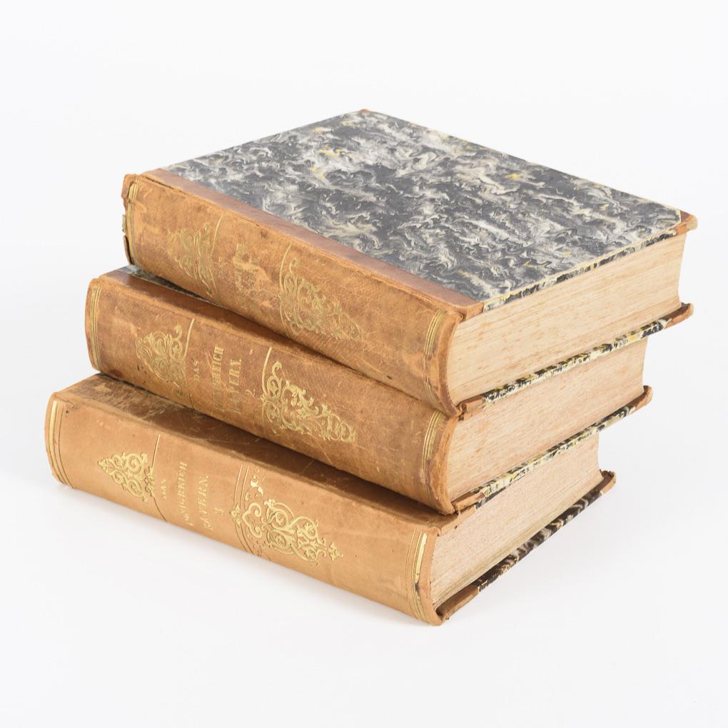 Band 1: 484 Textseiten und 59 von 61 Stahlstichen (Pappenheim Kirche und Streitberg fehlen; Quakenschloß und Riesenburg sind auf einem Blatt abgebildet; dafür zwei unterschiedliche Blätter zum Englischen Garten anstelle einem aufgeführten; Das Blatt "Kloster Michelsberg und die Altenburg bei Bamberg" ist handschriftlich korrigiert auf "St. Jakob und die Altenburg bei Bamberg"; eines der Blätter fehlt dann aber. / Band 2: 482 Seiten, 60 von 60 Stahlstichen vorhanden. / Band 3: 490 Textseiten, alle angegebenen Stiche außer München Universität sind vorhanden. Halbledereinbände. Blöcke etwas stockfleckig, Nutzungsspuren.
