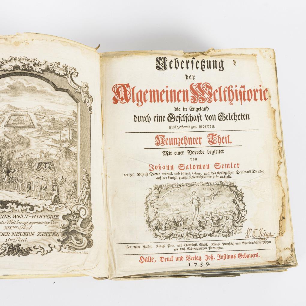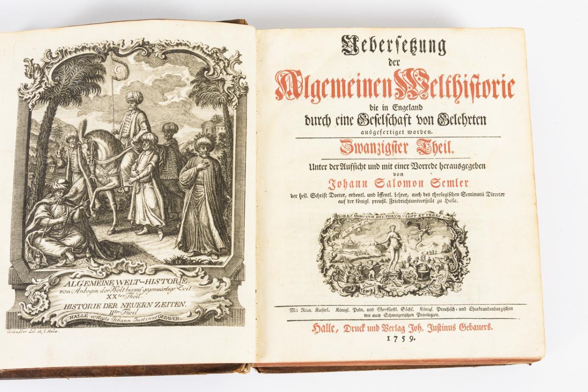 19. und 20. Theil in einem Buch. 19. Theil: "... Historie von Arabien von den Zeiten Mohammeds an enthält. ... darin das Leben Mohammeds historisch und critisch vorgetragen." Titelkupfer, Titelblatt, (44), 703 Seiten und 4 Abbildungen, vollständig. 20. Theil: Titelkupfer, Titelblatt, 30, 724 Seiten und 3 Abbildungen. // 20. Theil: (doppelt) "... welche die Begebenheiten der in diesem Theil fortgesetzten arabischen Geschichte, vom 96 bis 566sten Jahr der Heijra, oder 714 bis 1170sten Jahr der christlichen Zeitrechnung, enthalten." 30, 724 Seiten und 3 Tafeln. / 21. Theil: "Die Begebenheiten unter dem Khalifat ... von 566 bis 622sten Jahr der Hejra, oder Jahr Christi1171 - 1225. Algemeine Historie der Türken ... Algemeine Historie der Moguln und Tatarn, von der Zeit des Jenghiz Khan." Titelkupfer, Titel, 50, 664 Seiten und 3 Abbildungen bzw. Karte. / 23. Theil: "Algemeine Historie der Turkmanen und Uzbeken. Historie von Hindustan oder dem Reiche des grossen Mogul. Historie der ... Halbinsel Indiens". Titelkupfer, Titelblatt, 30, 678, (34), 2 Karten und 5 bildliche Vignetten. 3x gleiche Ledereinbände mit starken Gebrauchsspuren, Blöcke fest. / Ein Band im Pergamenteinband mit starken Gebrauchsspuren, einzelne Seiten lose, gelegentlich Papierfraß.