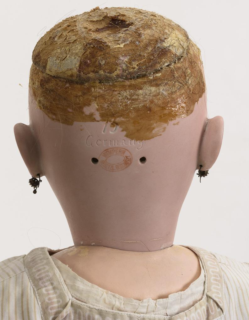 Kurbelkopf, blaue Schlafaugen mit Echthaarwimpern, Ohrlöcher, lange braune Echthaarperücke. 11-teiliger Gliederkörper mit Federspannung. Helles Kleid mit Nadelstreifen, Haarkranz, alte schwarze Kinderschuhe. Kopfdeckel fest verklebt: nicht durchleuchtet, lediglich 1 Brandriss hinter dem rechten Ohr sichtbar. Körper teils übermalt.