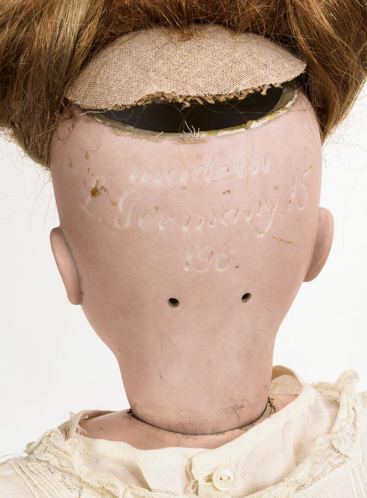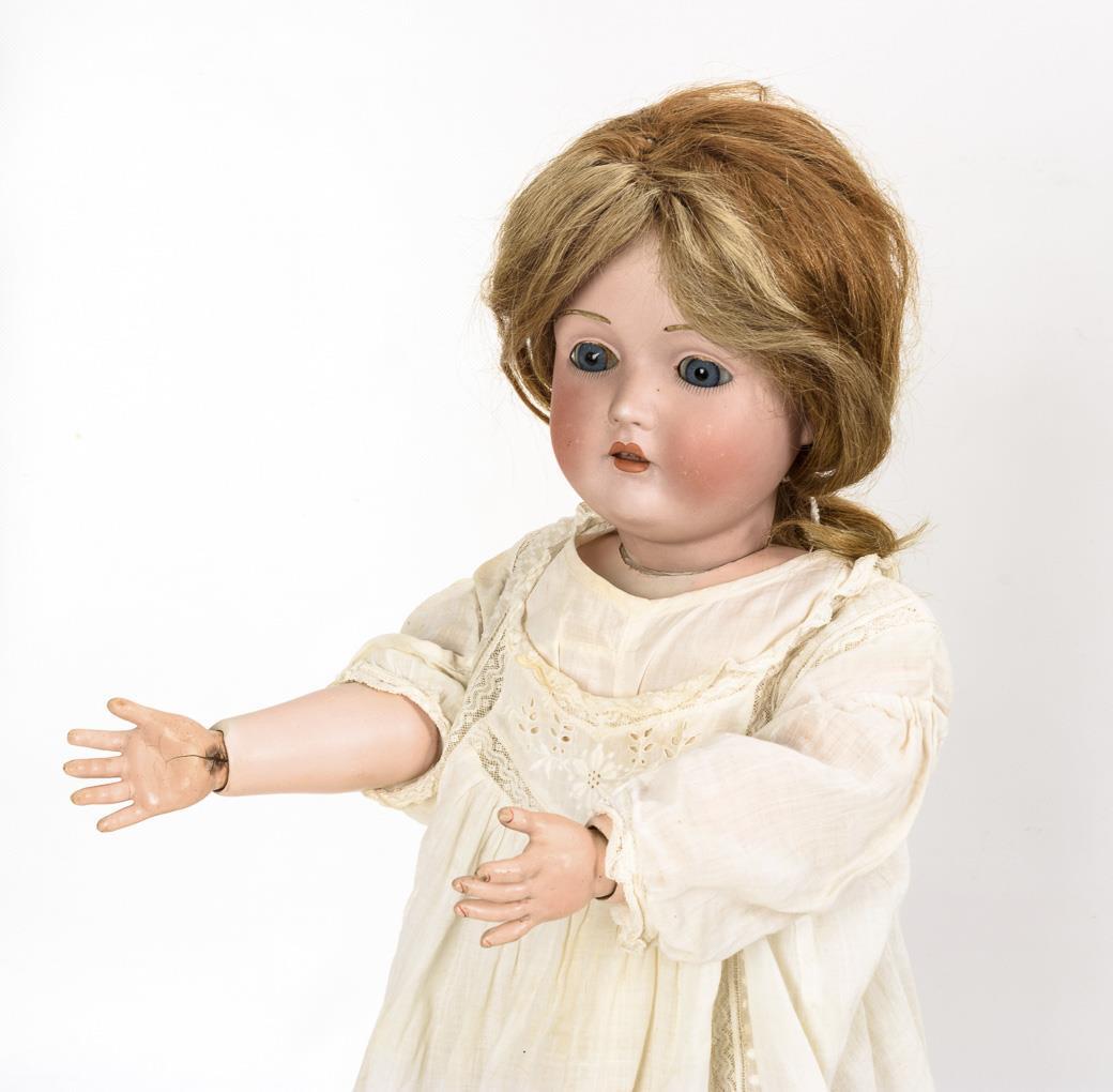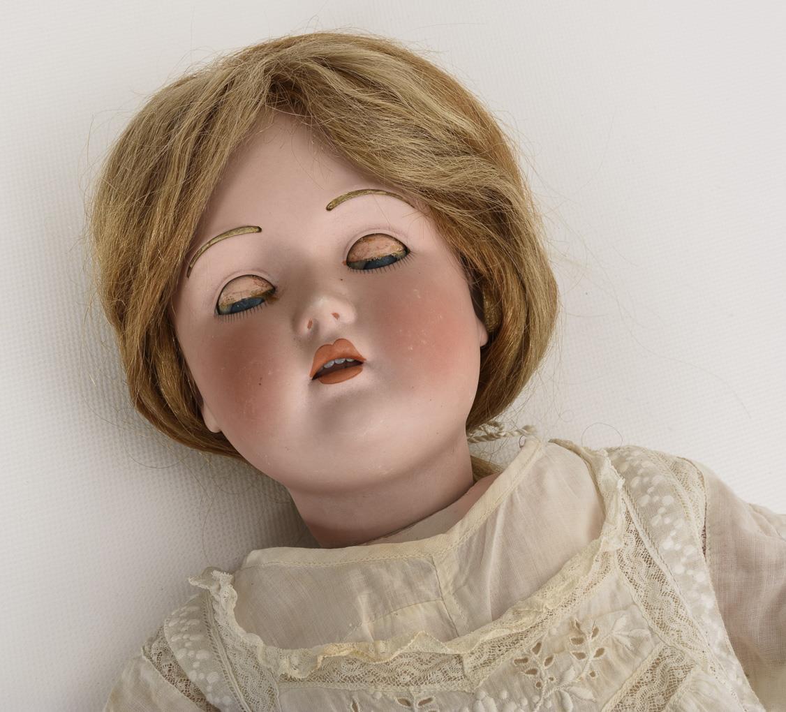 Kurbelkopf, blaue Schlafaugen, Echthaarperücke, Reste von eingelegten Fellaugenbrauen. 15-teiliger Gliederkörper. Altes weißes Kleid, schwarze Lackschuhe. Am Hinterkopf haarrissig. Körper mit Farbdefekten und Reparaturen.