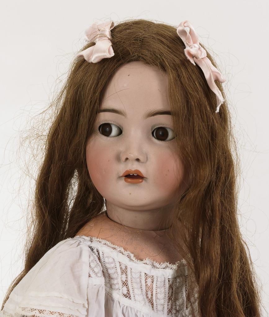 Kurbelkopf, braune Schlaf-/Schelmenaugen, Pappzunge, braune Echthaarperücke. 17-teiliger Gliederkörper mit langen Unterschenkeln. Altes weißes Kleid, dunkelblaue Strümpfe. Kleiner Ausbruch im linken Augenwinkel, minimaler Perückenpull. Körper mit Reparaturen (Torso und Hände), Beine lose gespannt.