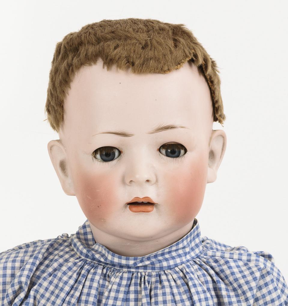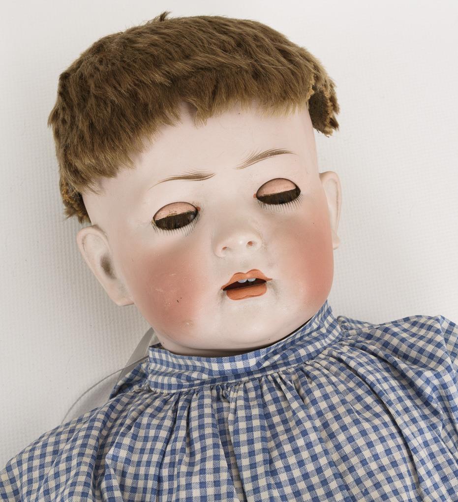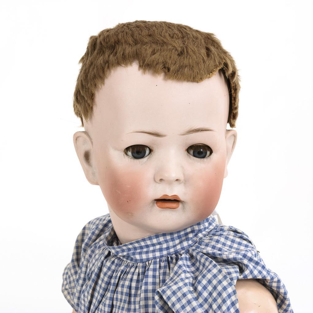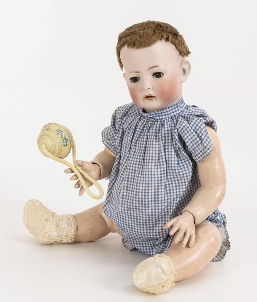 Kurbelkopf, blaue Schlafaugen, Wimpern. 7-teiliger Sitzbabykörper, ergänzte alte Fellperücke. Kariertes Hemdhöschen, weiße Stoffschuhe. Dazu alte Zelluloidrassel. Hinterkopf minimal haarrissig, Hände überarbeitet.