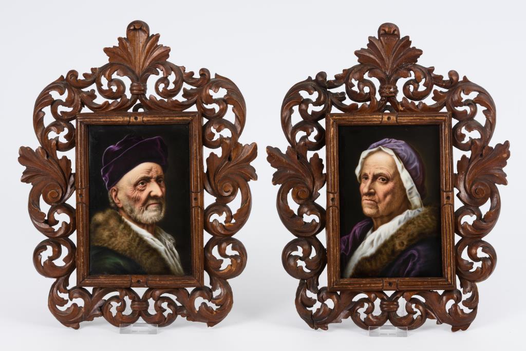Rechteckige Platten mit der fein gemalten Darstellung einer alten Frau bzw. eines alten Mannes im Pelzmantel, nach Porträtbildern des Malers Balthasar Denner (1685-1749). Rahmen teils mit Reparaturstellen.
