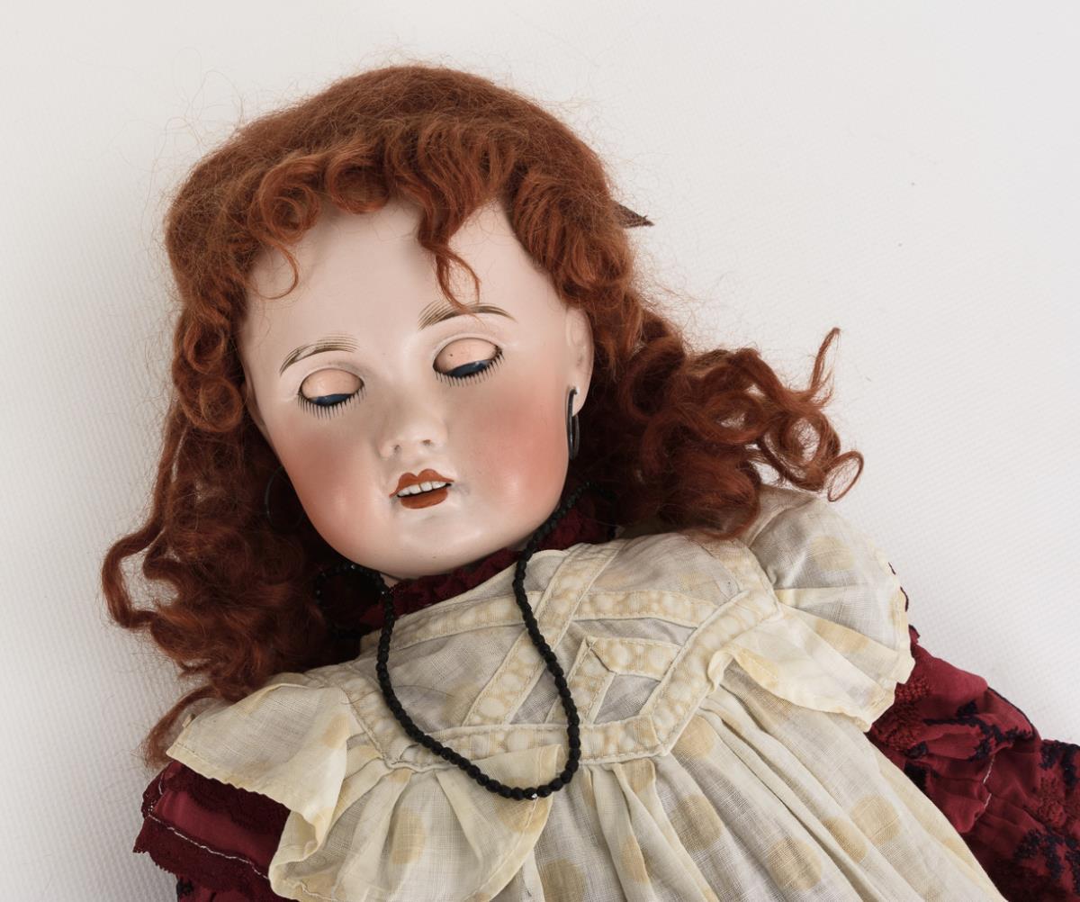 Kurbelkopf, blaue Schlafaugen, Ohrringe, rotgelockte Mohairperücke. 11-teiliger Gliederkörper mit intakter Zugstimme. Weinrotes Kleid, weiße Schürze, schwarze Schuhe. Kopf durchleuchtet: ohne Defekte, lediglich kleiner Produktionsfehler an der Halskurbel. Körper mit kleinen Farbdefekten, 2 Finger fehlen.
