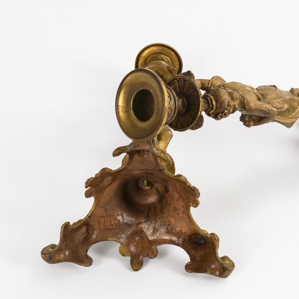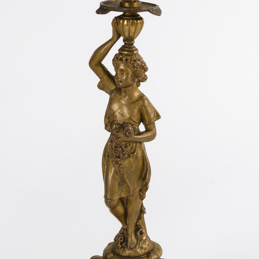 Figurenleuchter mit vollplastischen Mädchenfiguren, die Blumen tragen. 1 Sockel mit kleiner Ausbesserung und gerissener Volute, sonst kaum Alters-/Gebrauchsspuren.