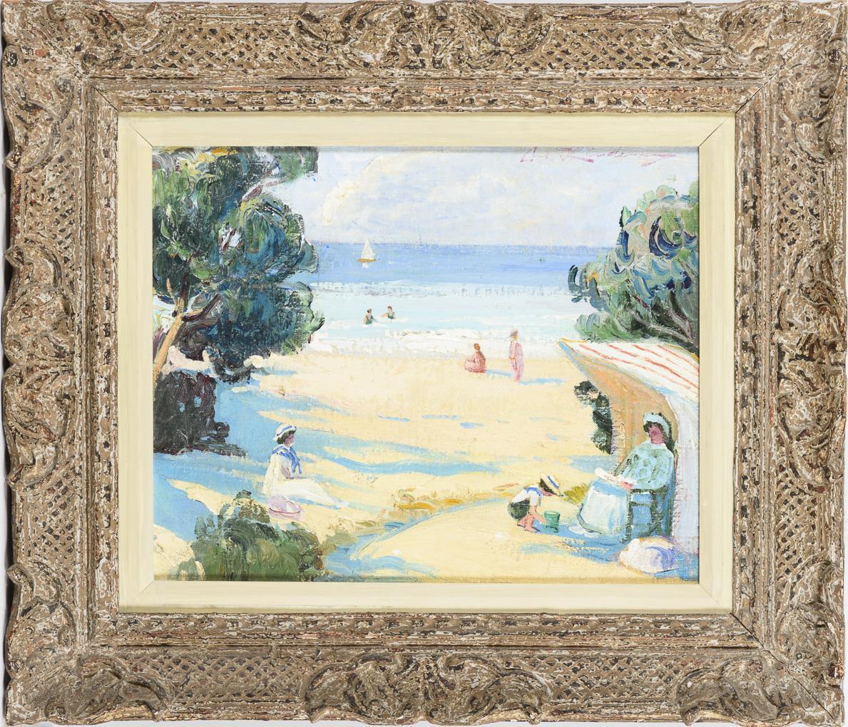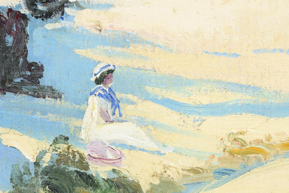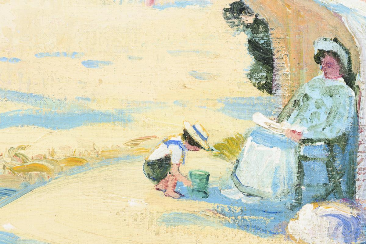 Mehrere Personen in der Kleidung des frühen 20. Jahrhunderts bei hellem Sonnenschein in den Strandkörben am Wasser.
