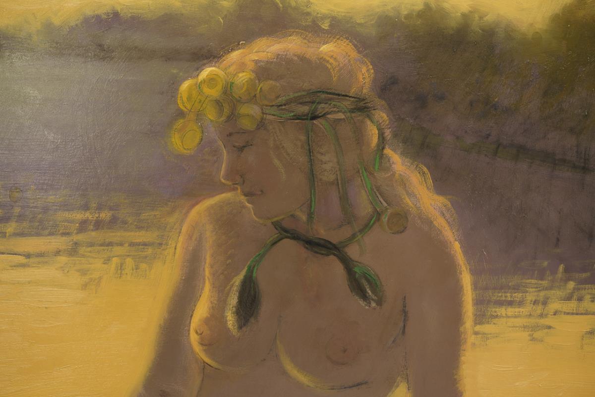 Zwei nackte Frauen am Abend in einem Boot auf dem See.