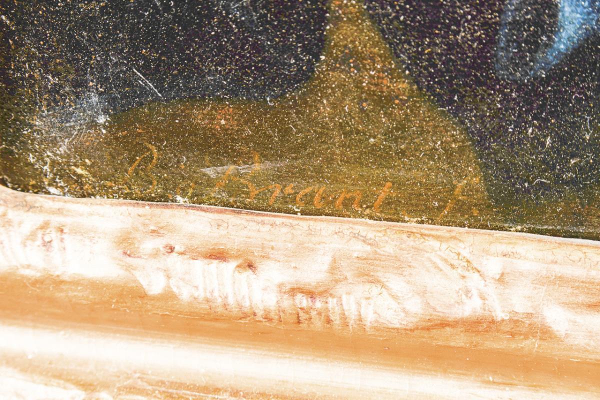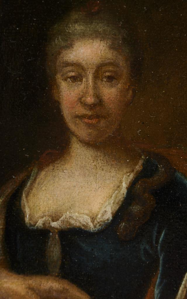 Bildnis eines Malers in seidener Kleidung mit blauem Mantel an der Staffelei mit einem Damenbildnis. Leinwand doubliert.