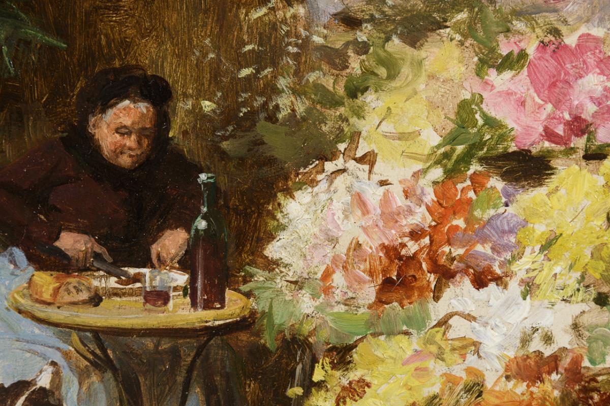 Ältere Blumenverkäuferin bei einer Mahlzeit an ihrem Marktstand neben den prächtig blühenden Pflanzen.