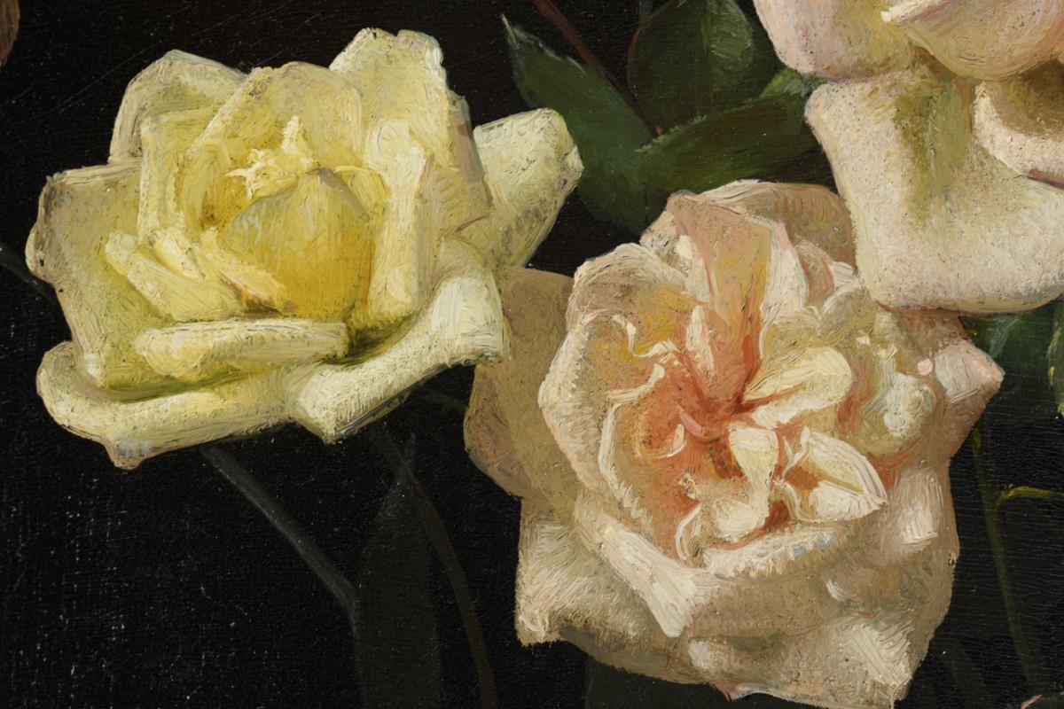 Verschiedenfarbige Rosen mit geschlossenen und weit geöffneten Blüten vor dunklem Hintergrund. Altersspuren.