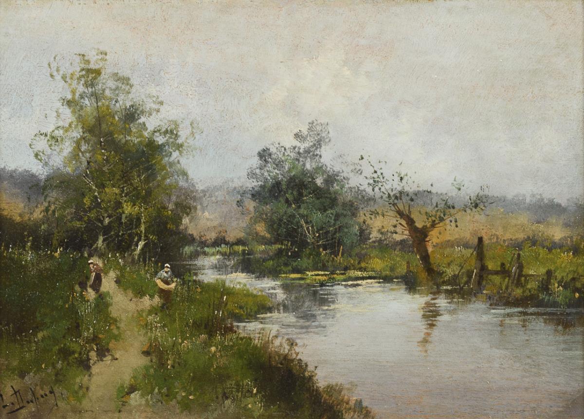 Staffagefiguren in den Wiesen nahe dem Flussufer unter bedecktem Himmel. Leichte Altersspuren.