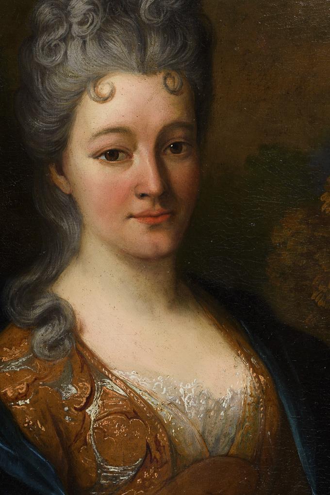 Bildnis einer jungen Frau in prunkvollem Kleid mit blauem Mantel in herbstlicher Landschaft. Restauriert mit Hinterklebungen.