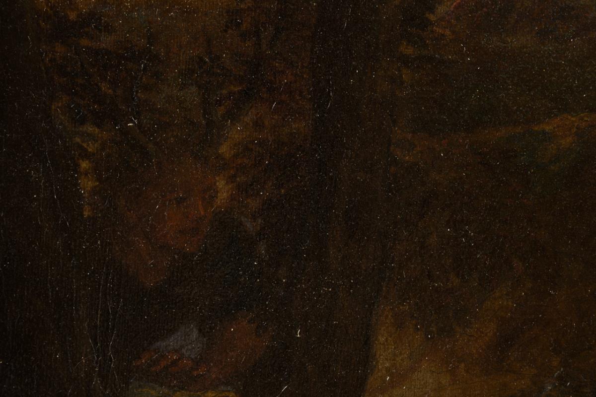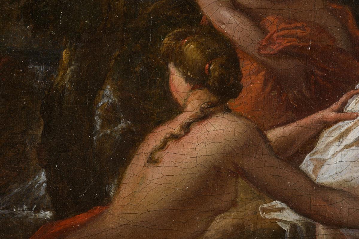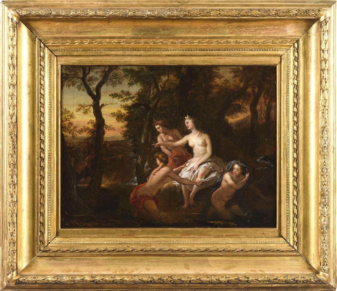 Diana erblickt den sie und ihre aufgeschreckten Nymphen beobachtenden Aktaion und verwandelt ihn in einen Hirsch. Leinwand doubliert, Altersspuren.