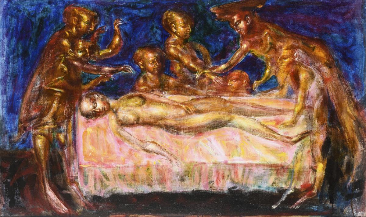 Lagernder Frauenakt, umringt von verschiedenen Personen, vor blauem Hintergrund.