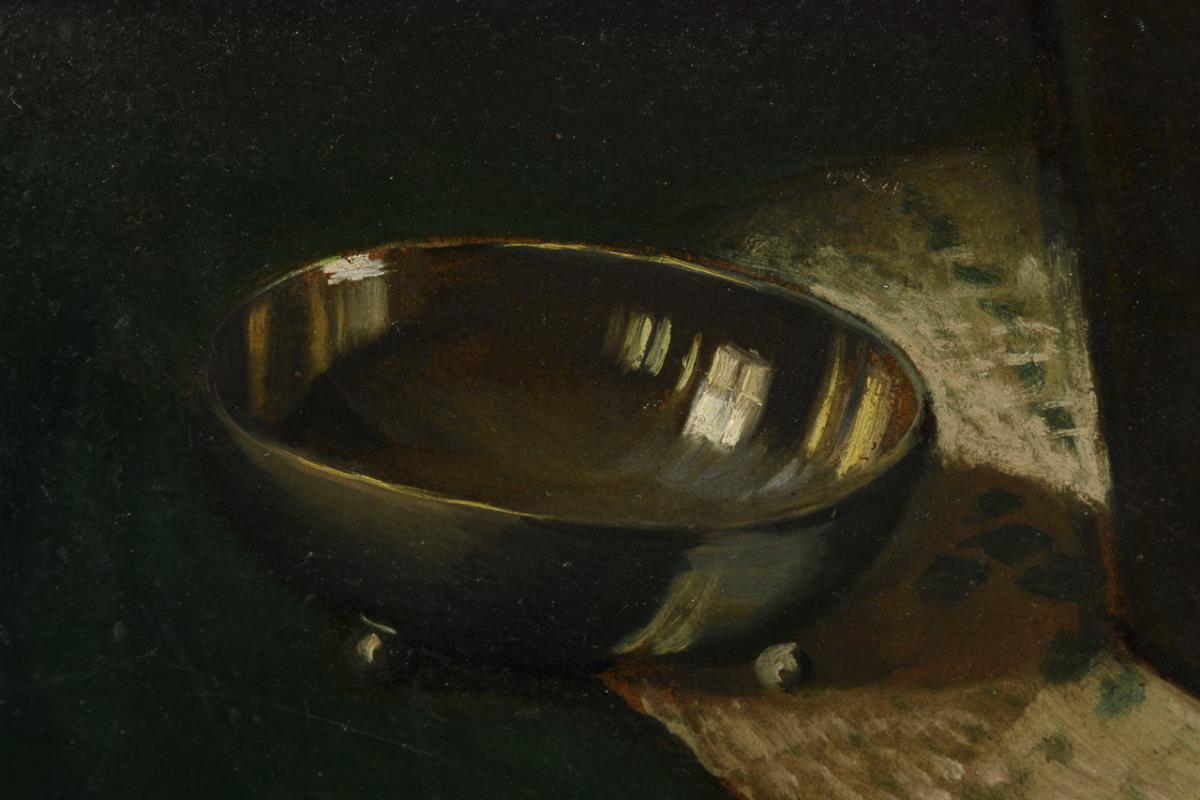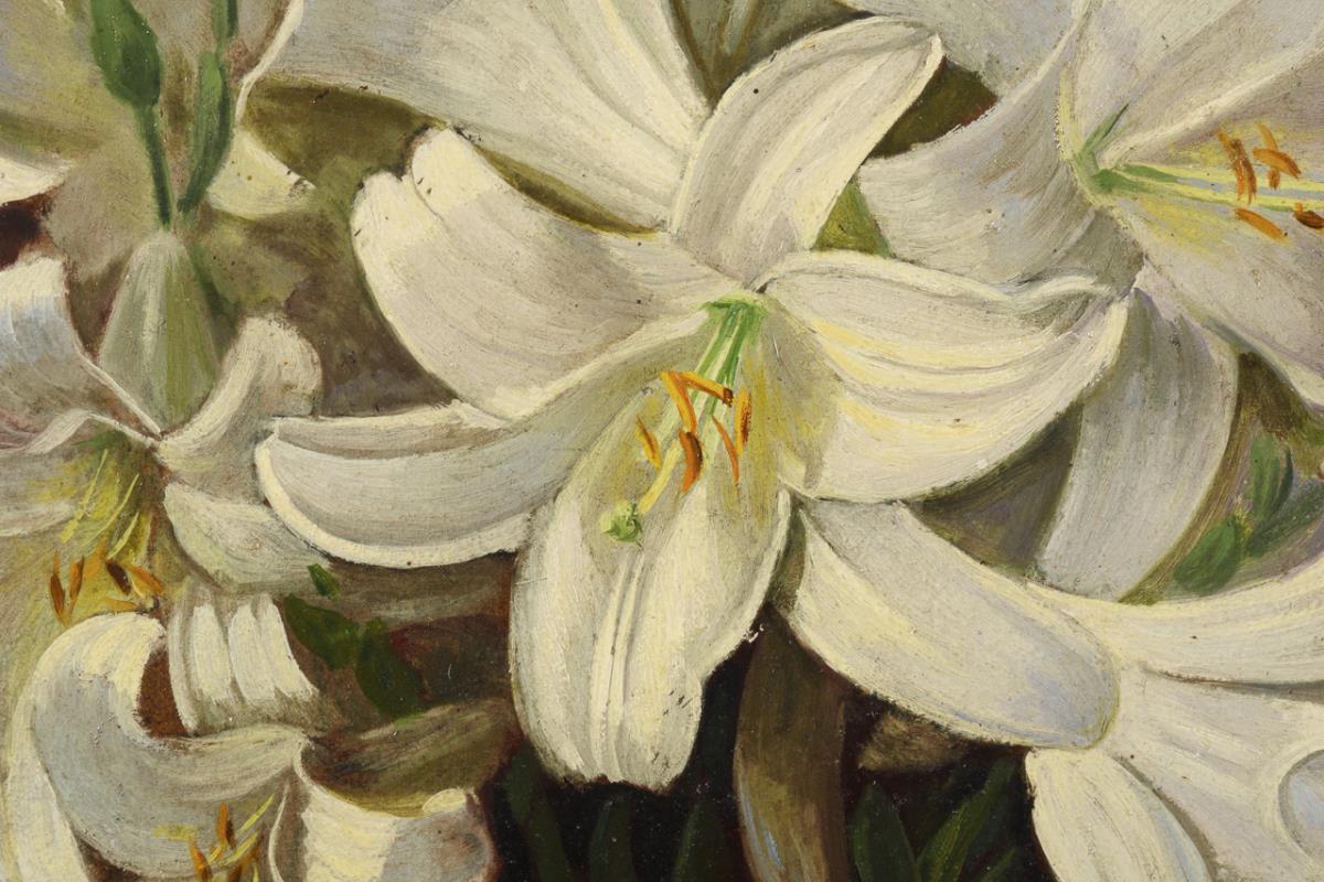 Weiße Lilien in schlanker Vase mit Frosch und Eidechse neben einer silbernen Schale.