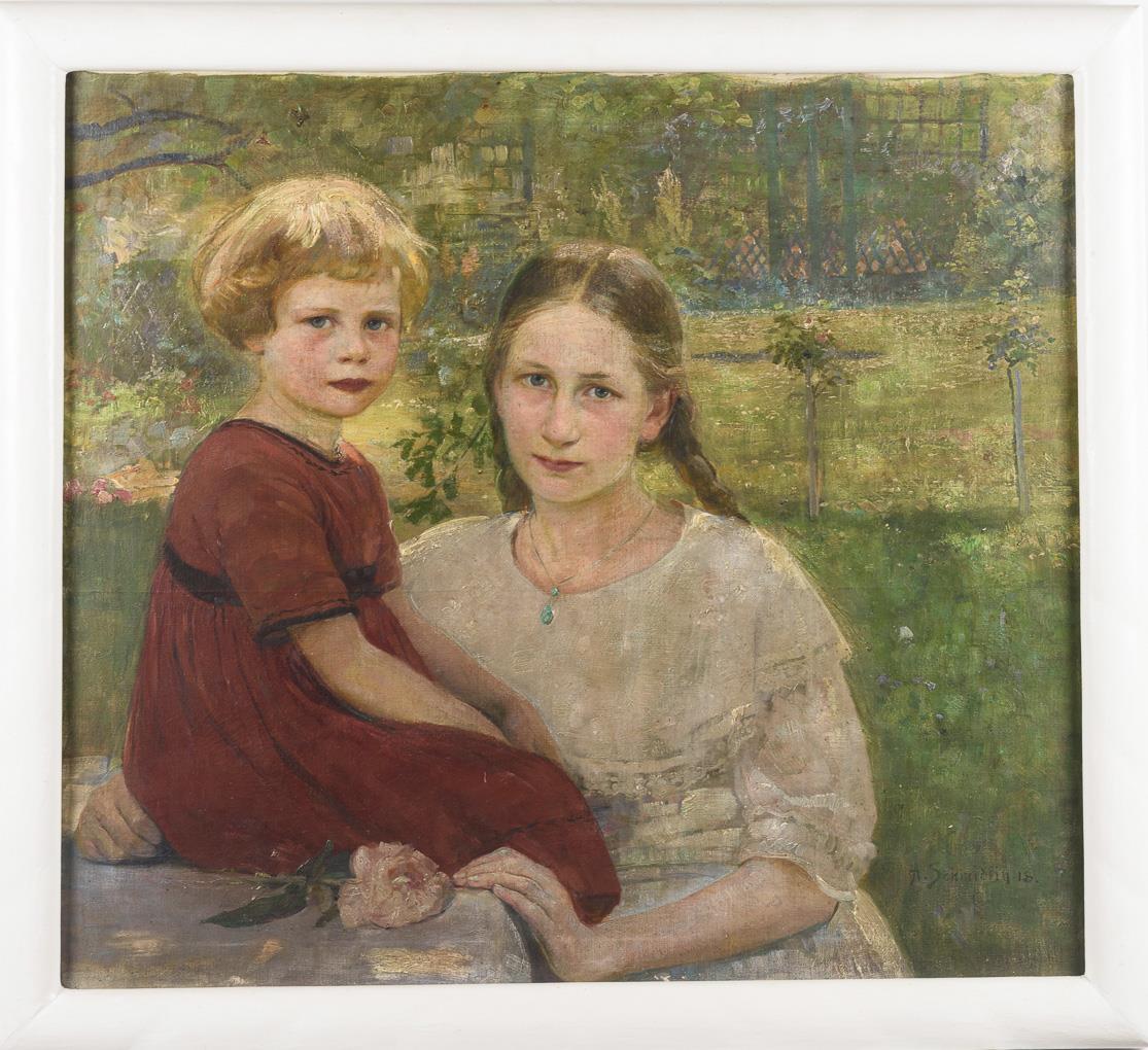 Die beiden Mädchen in weißem und rotem Kleid in einem Garten im Sonnenschein. Leichte Altersspuren.