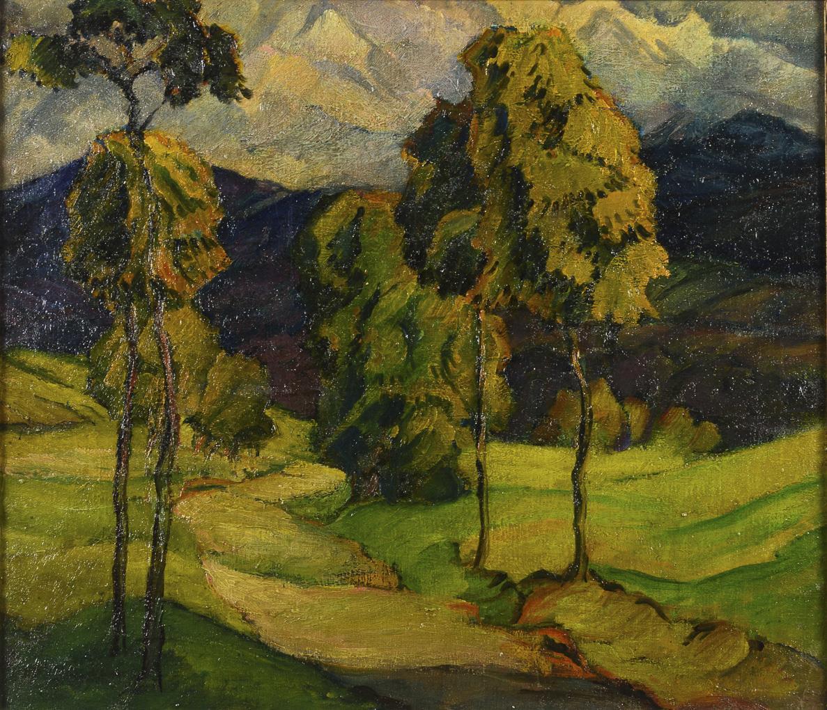 Expressiv gemalte schlanke Bäume auf saftigen Wiesen vor dem Gebirge. Leichte Altersspuren.