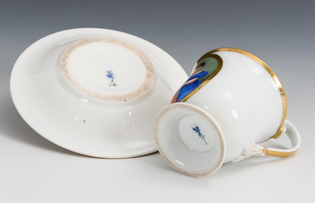 Polychrome Malerei, Goldstaffage.H Tasse 9,5 cm, Ø originale Untertasse 13,5 cm.