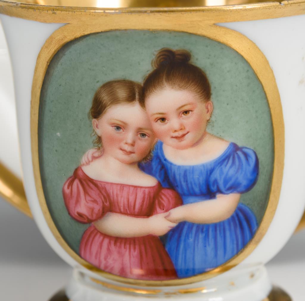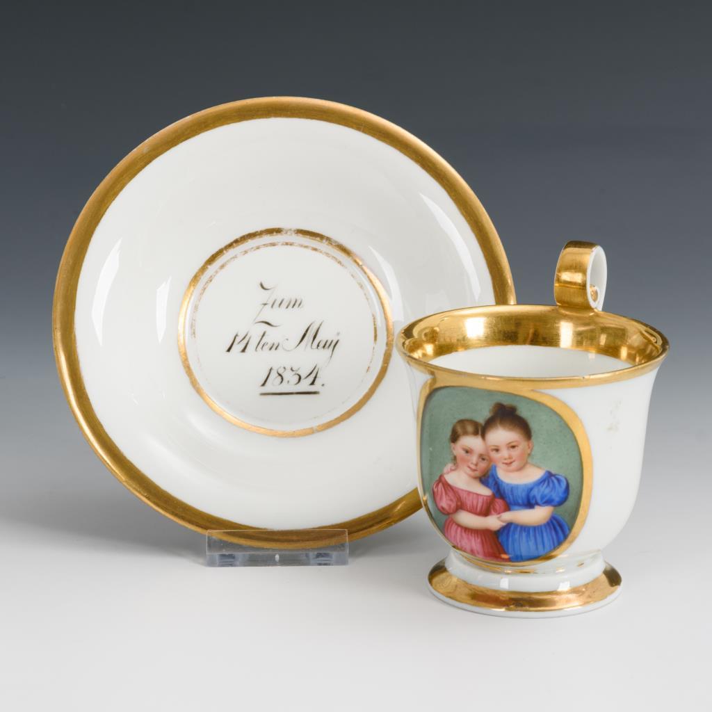 Gefußte Glockentasse mit Blatthenkel. Schauseitig ein Medaillon mit der Darstellung zweier Kinder, im Spiegel der Untertasse die Widmung "Zum 14ten May 1834". Minimaler Goldabrieb im Untertassenspiegel, Bestoßung am Tassenrand.