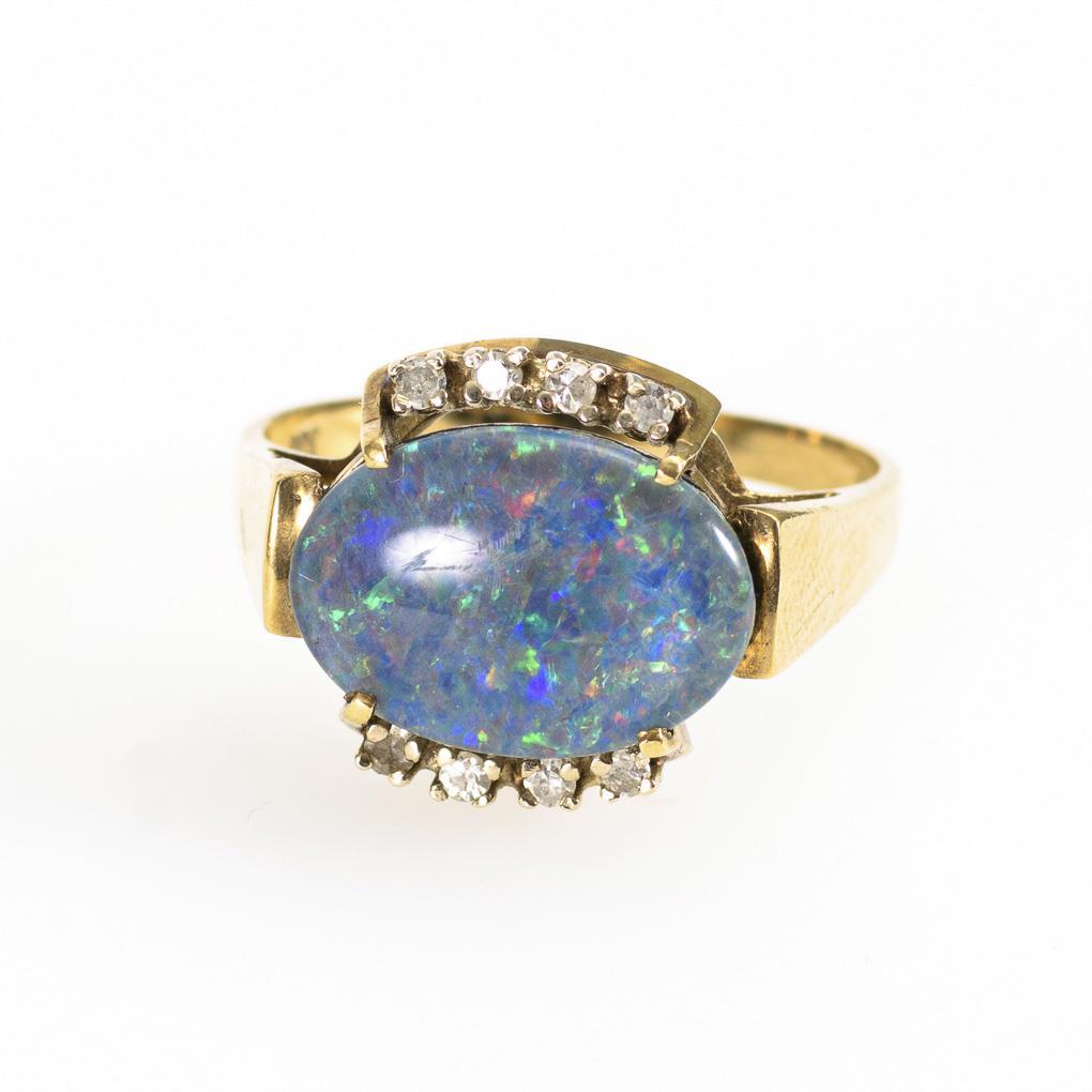 Opaltriplette zwischen kleinen, farblosen Steinen. Schmale Schiene.