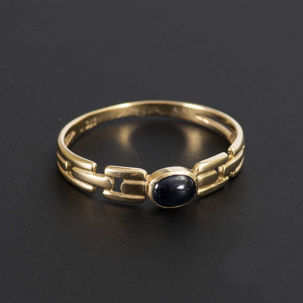 Saphircabochon zwischen kettenartig durchbrochener Mitte. Schmale Schiene.