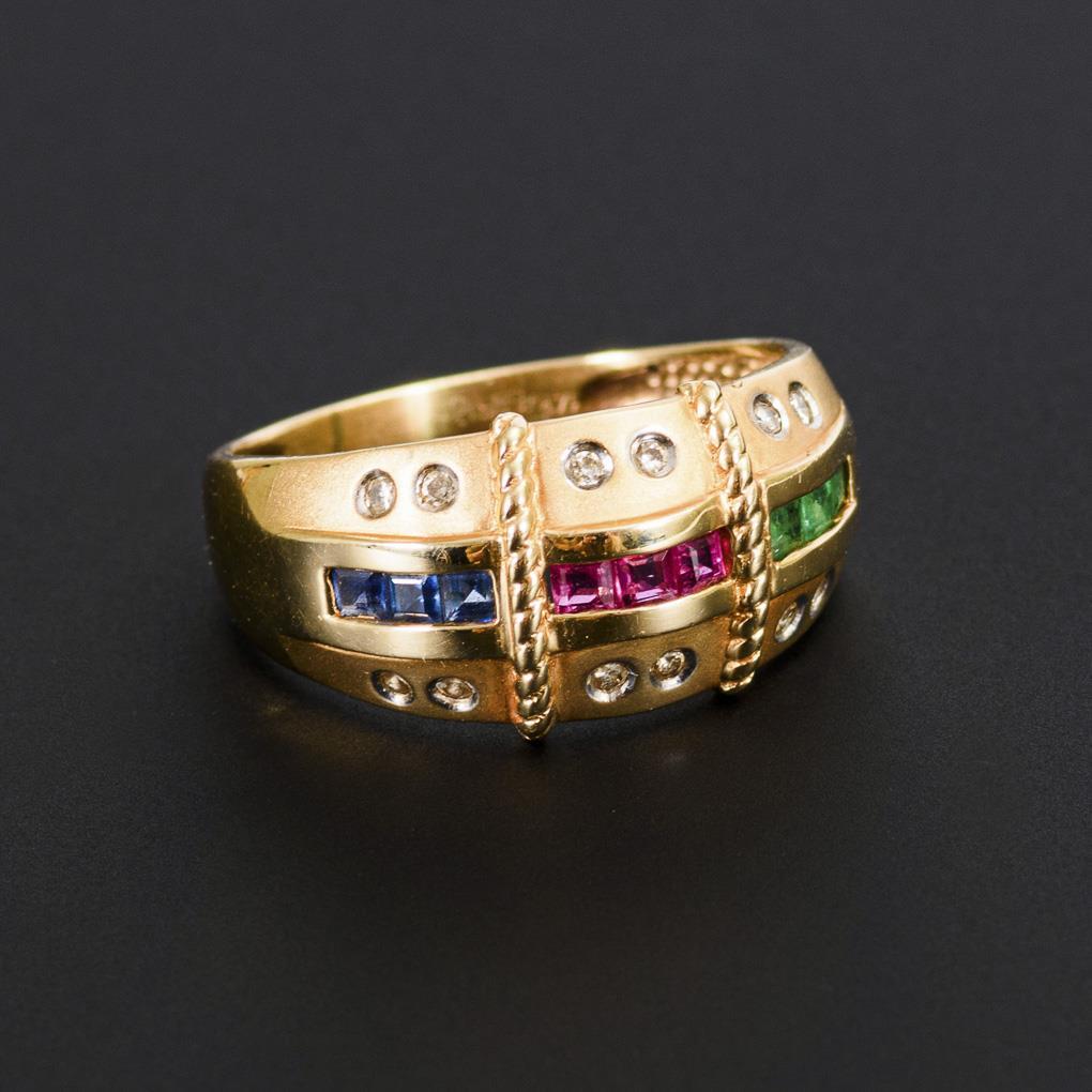 Smaragd-, Saphir-, und Rubincarrés sowie eingelassene Kleinstdiamanten zwischen breiter Verlaufschiene.