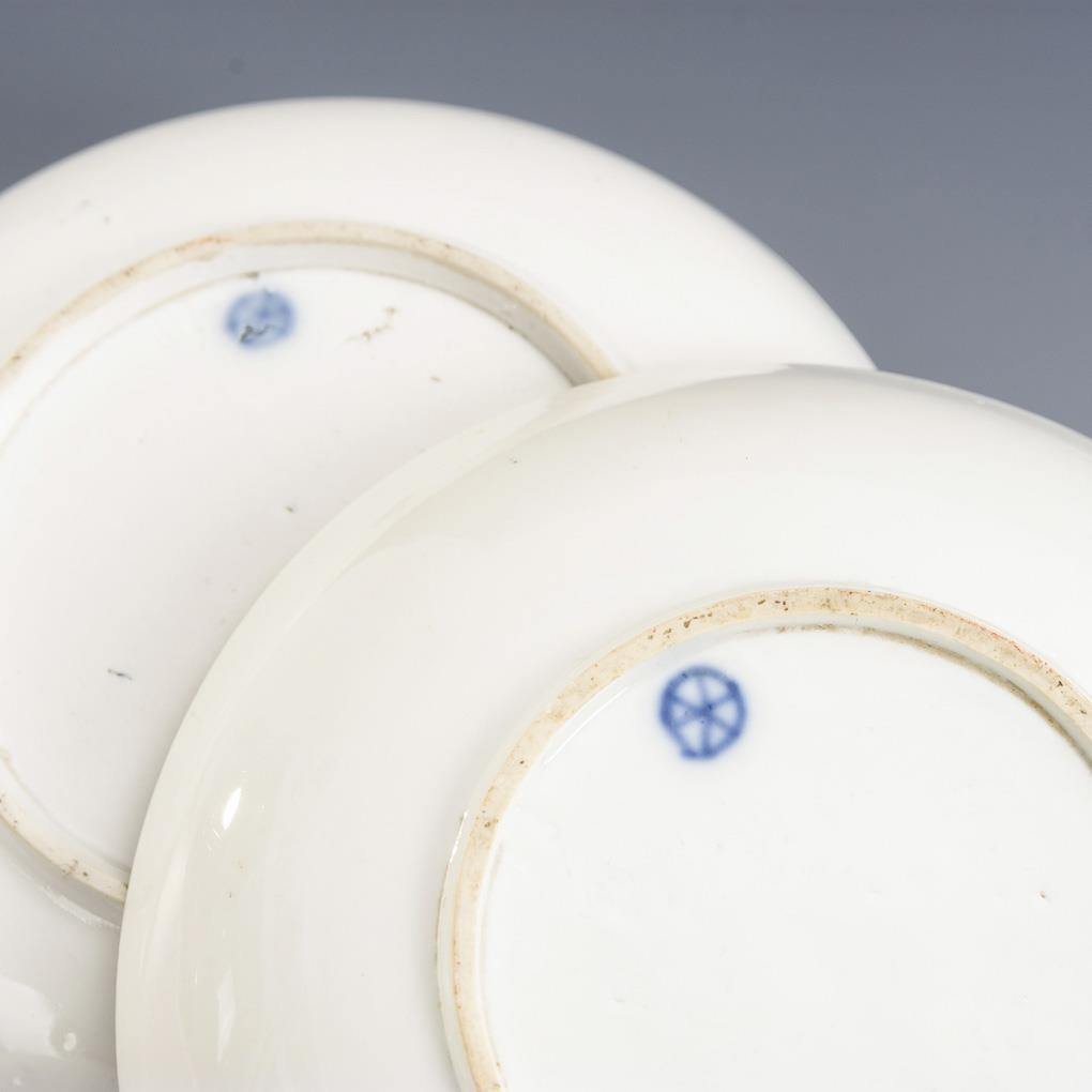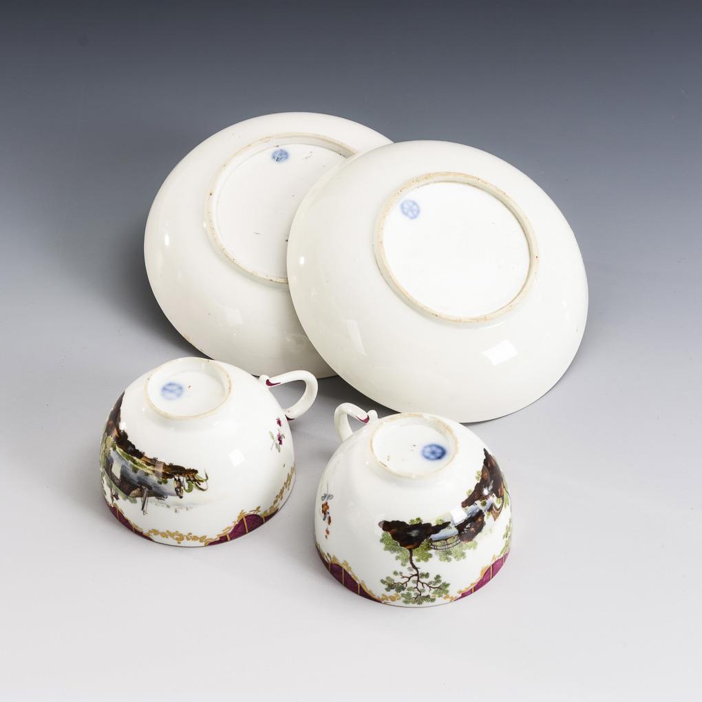 Polychrom bemalt, goldstaffiert. H Tassen 4,5 cm, Ø originale Untertassen 12,5 cm.