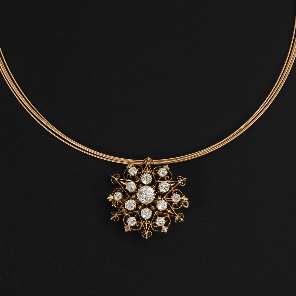 Historismusbrosche/Anhänger mit Altschliff-Brillanten an moderner Collierkette.
