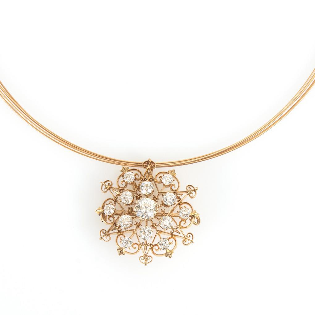 Filigran gearbeitete Sternbrosche, besetzt mit 13 feinen Altschliff-Brillanten. Hakenverschluss und Hakenöse. Als Ergänzung 4-reihige Collierkette mit Karabinerschließe.