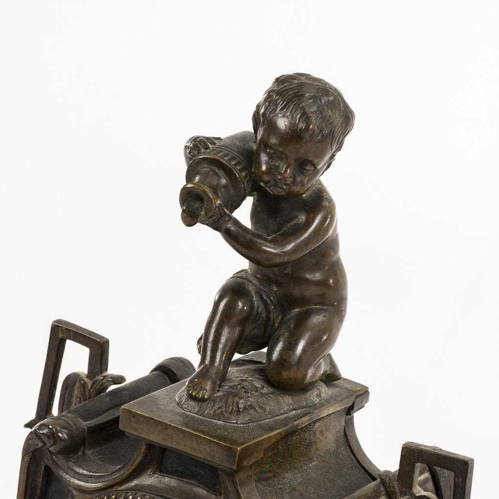 Tailliertes Gehäuse im Louis Seize-Stil, mit bekrönendem Putto als Wasserträger, seitlichen gewinkelten Handhaben, Festonzier und musikalischen Symbolen. Zifferblatt mit Defekten.