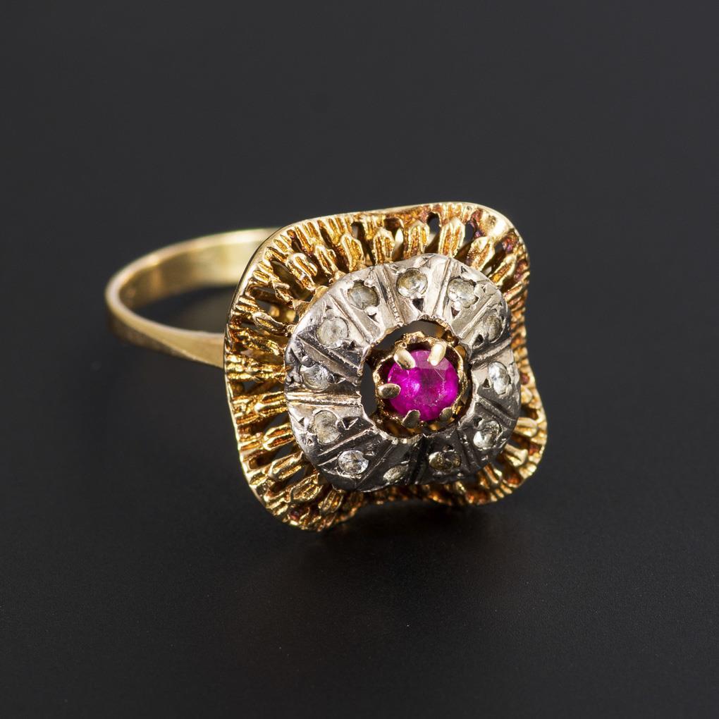 Krappengefasster Rubin, umringt von kleinen farblosen Saphiren auf durchbrochenem Ringkopf. Schmale Schiene.