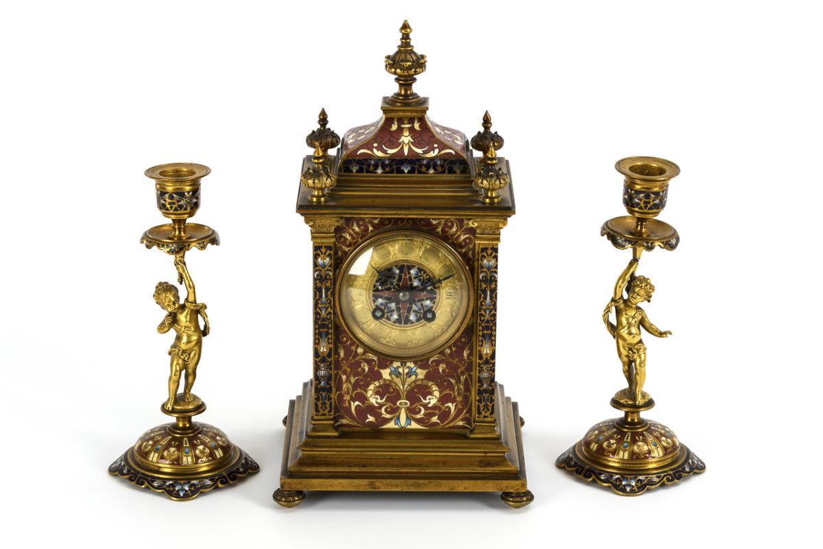 Messing, farbige florale Emaileinlagen. Uhr H 29 cm, Beisteller H 19,5 cm. 4,2 kg.