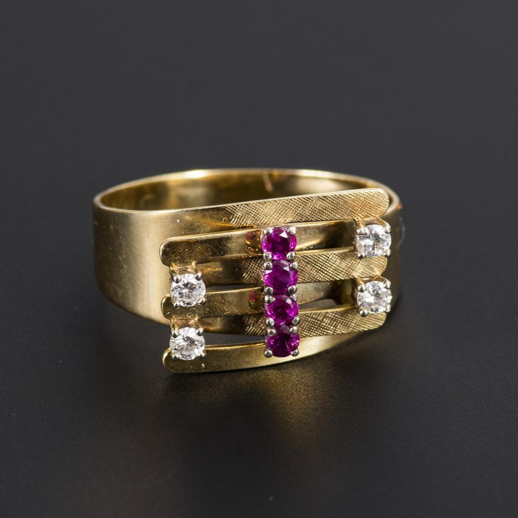 Chatongefasste Rubine und Brillanten auf Zierstegen zwischen breiter Schiene.