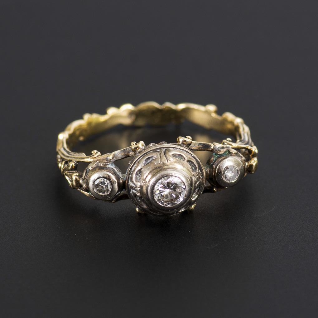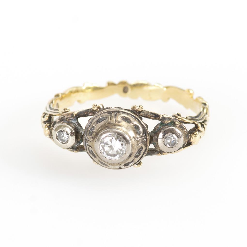 Gelbgold 585/Silber geprüft. Steine gesamt ca. 0,18 ct. Ringgröße 58. 3,6 g.