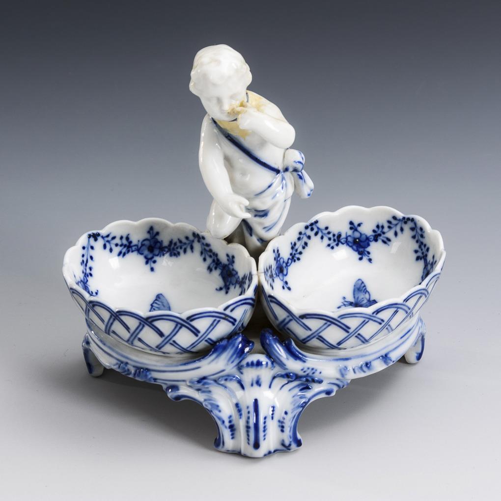 Zwei Gewürzschalen mit Salzlecker (H 12,5 cm). / Gärtner mit Henkelkorb als Gewürzschale (H 22 cm. Hals und linke Hand des Salzleckers alt restauriert, Tuchzipfel bestoßen; beide Henkel am Korb und 1 Rocaillefuß am Gärtner alt restauriert.