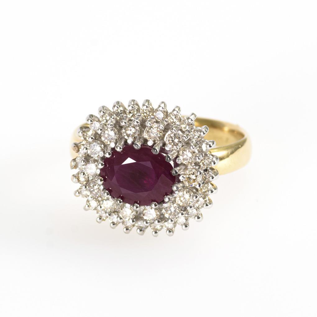 Gelbgold/Weißgold 585 gestempelt. Brillanten gesamt ca. 0,70 ct. H-I/si-PI. Rubin ca. 1,77 ct. Ringgröße 57. 5,68 g.
