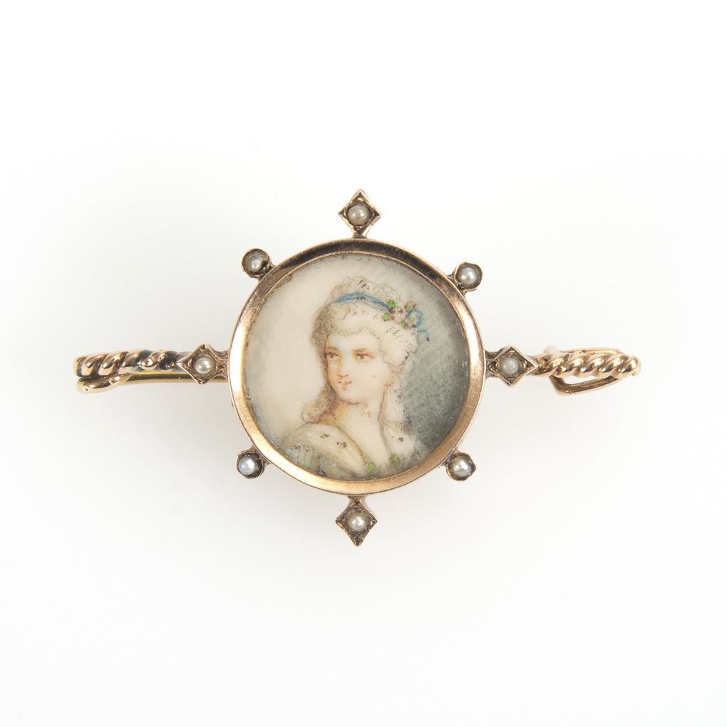 Verglast gerahmte Miniatur mit Mädchenbildnis, umringt von 8 Saatperlchen. Hakenverschluss.
