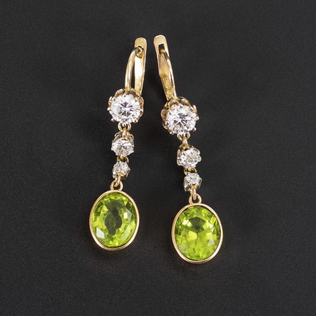 Ohrhängerpaar mit Peridoten, Brillanten und Altschliffbrillanten.