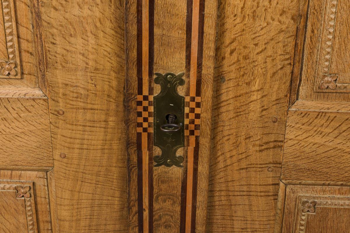 Breiter, 2-türiger Hallenschrank mit auskragendem Gesims und Sockel, auf kannelierten Pfeilerfüßen, Seitenteile und Türen kassettiert, dekoriert mit Sternintarsien, Zierleisten und geometrischen Ornamenten; innen geheimes Sockelfach mit herausnehmbarer Bodenplatte, mehrere Einlegeböden anbei. Wohnfertig restauriert, Alters-/Gebrauchsspuren, Trockenrisse.