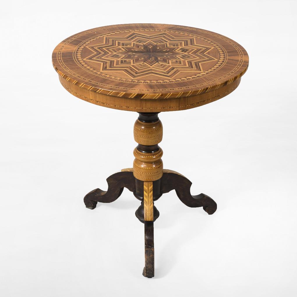 Zierlicher Salontisch mit fein gegliederter Sternmarketerie, auf teils verzierter Baluster-Mittelstütze mit 3 geschwungenen Beinen, Tischplatte nummeriert "PP 49", etikettiert "Sigmaringen (Germania)". Wohnfertig restauriert, Alters-/Gebrauchsspuren.