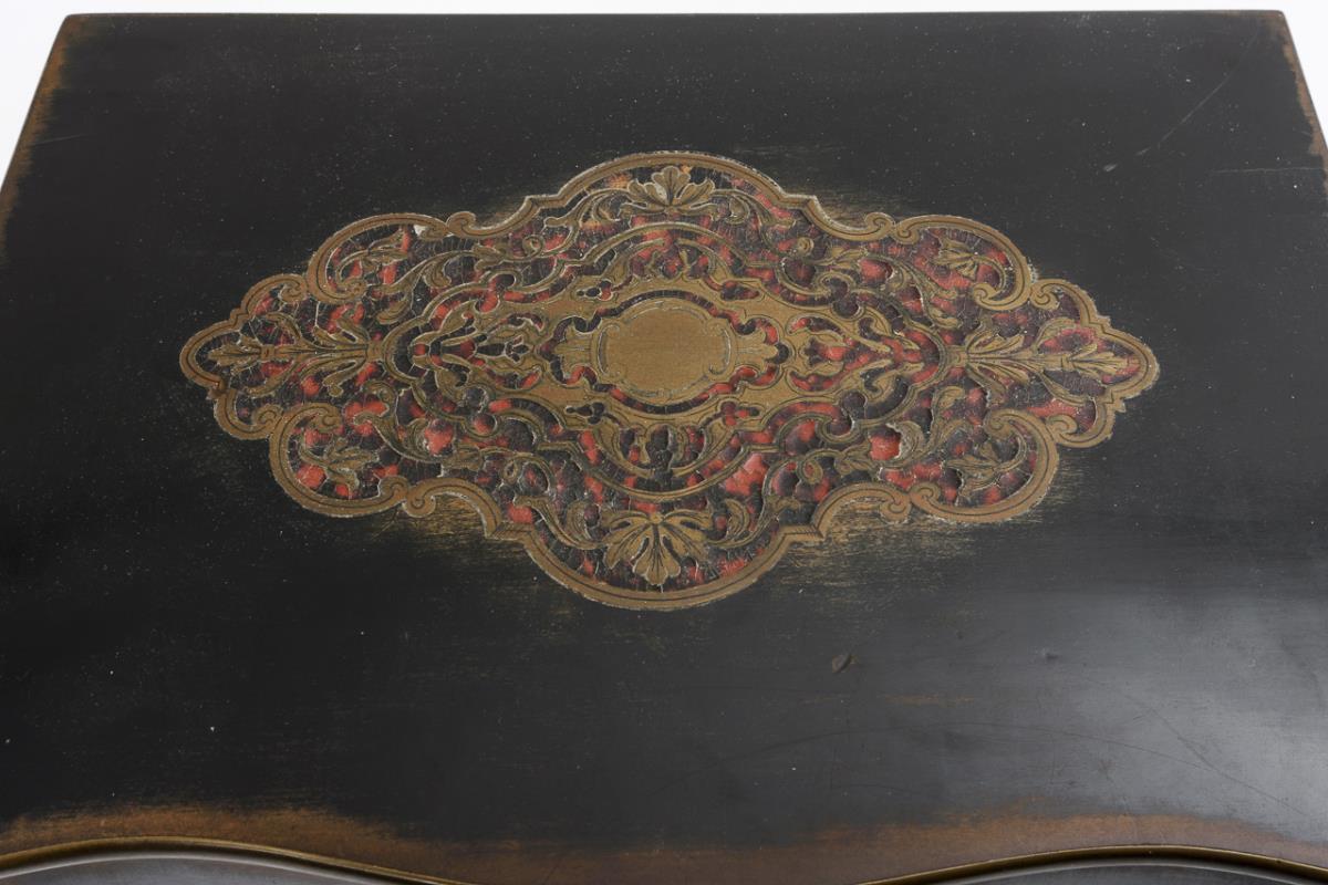 Außen ebonisiertes Holz, innen Mahagoni furniert, in der Front und auf dem Scharnierdeckel je eine Kartusche mit Messing-Schildpatt-Boulle, Bronzegriffe, im Deckel Spiegel mit Bronzerahmen. In Form geblasenes Glas goldstaffiert. 28 x 38 x 27 cm.