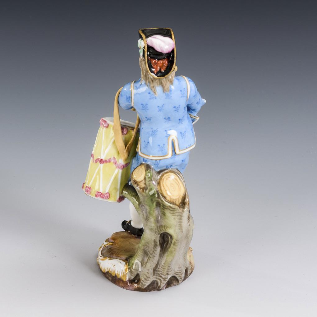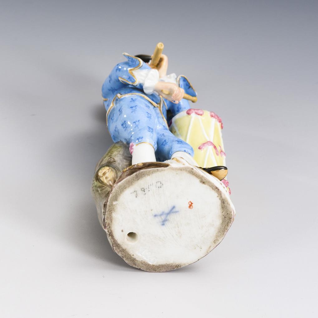 Pariser Ausrufer mit Trommel und Flöte. Kleine Bestoßung am Stand, beide Hände, Trommelband, Trommelstock, Flöte und Hut restauriert.