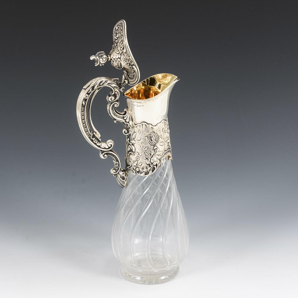 Schlanke, leicht gebauchte Karaffe mit floral reliefierter Silbermontierung, Rocaillenhenkel und Scharnierdeckel mit Patentgriff.