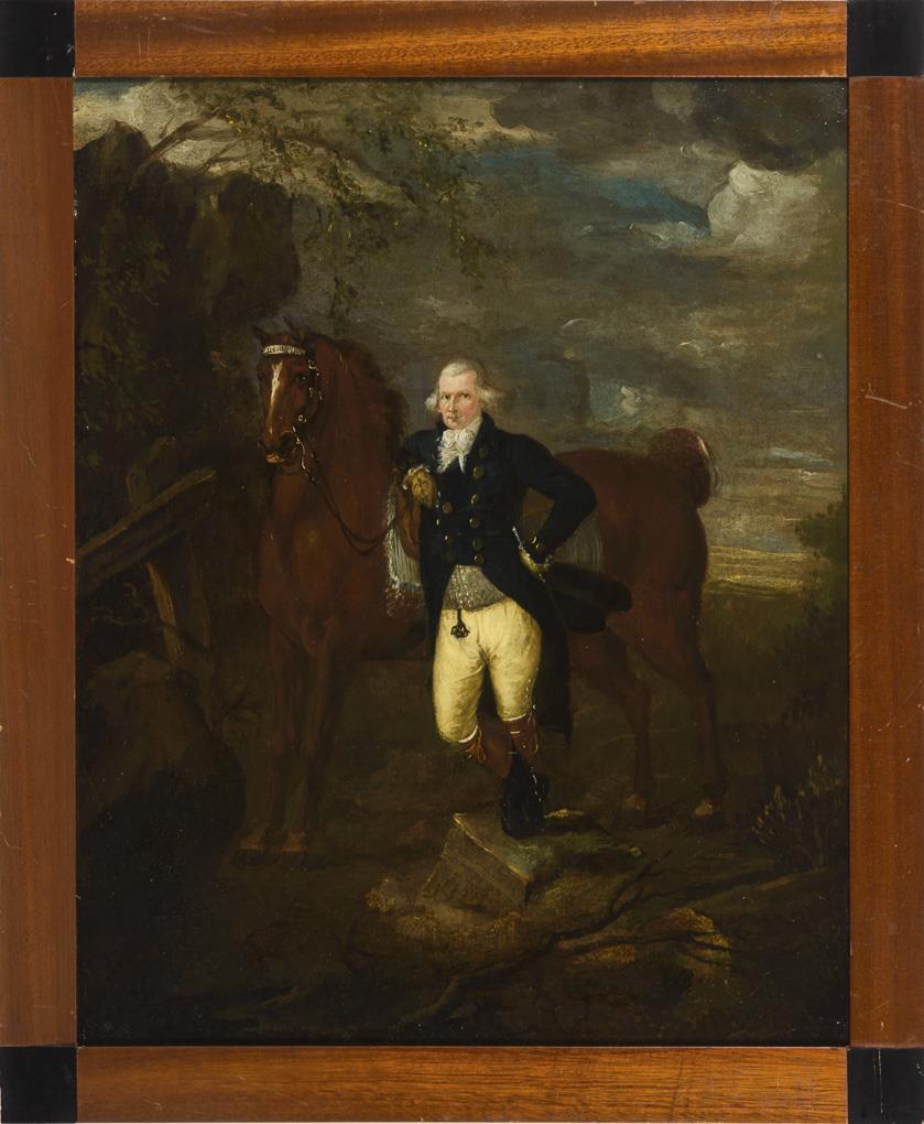 Bildnis eines Adligen in gelb-blauer Kleidung vor dem großen Pferd in bergiger Landschaft unter wolkigem Himmel. Leichte Altersspuren.